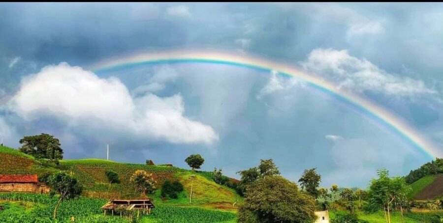 જેમ દરેક ઋતુનું એક વિશેષ મહત્ત્વ હોય છે તેમ દરેક ઋતુનું આગવું સૌંદર્ય હોય છે. એમાંય ચોમાસામાં વરસતા વરસાદનું સૌંદર્ય અને વરસાદ બંધ થયા બાદ મેઘધનુષનું સૌંદર્ય ખૂબ જ આકર્ષક અને આહ્લાદક હોય છે. એમાંય વળી જો મેઘધનુષ ડુંગર પ્રદેશમાં દેખાય તો એનું સૌંદર્ય અદ્ભુત હોય છે. એને જોવું પછી એક લ્હાવો બની જાય છે. ગુજરાતના કાશ્મીર ગણાતા કવાંટ તાલુકાના આંબા ડુંગર પર જ્યારે મેઘધનુષી સપ્તરંગી પટ્ટો આકાશમાં છવાયો હતો ત્યારે પ્રકૃતિનું અદ્ભુત દૃશ્ય કેમેરામાં કેદ થઈ ગયું હતું જે પ્રસ્તુત તસવીરમાં દૃશ્યમાન થાય છે. આ સાત રંગો કે જેને ટૂંકમાં ‘જાની વાલી પીનાલા’ કહેવાય છે. “જાંબલી, નીલો, વાદળી, લીલો, પીળોે, નારંગી અને લાલ રંગ એમ સપ્ત રંગોથી બનેલું હોય છે મેઘધનુષ. આ સૌંદર્યનો રસ પીનારા પણ નસીબદાર છે. (તસવીર : હસન ખત્રી, ડભોઈ)