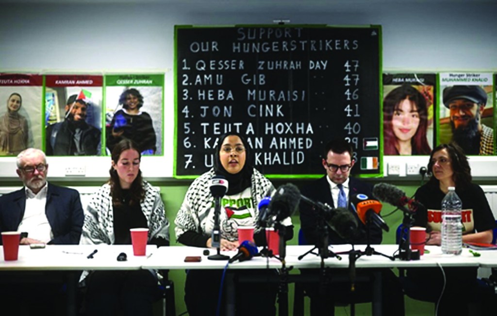 ટ્રાયલની રાહ જોઈ રહેલા આઠ પેલેસ્ટીની એક્શન અટકાયતીઓમાંથી કેટલાક, તેમના દુર્વ્યવહારનો વિરોધ કરવા અને જામીન પર મુક્તિની માંગ કરવા માટે ૪૭ દિવસ સુધી ખોરાક વિના રહ્યા છે.૨૦થી ૩૧ વર્ષની વયના આ સમુહ પર પેલેસ્ટીની એક્શન દ્વારા કરવામાં આવેલા ચોરી અથવા ગુનાહિત નુકસાન સંબંધિત આરોપોનો સામનો કરવો પડી રહ્યો છે, જેને સરકારે આતંકવાદ વિરોધી કાયદા હેઠળ પ્રતિબંધિત કર્યો છે.તેમના સમર્થકોના જણાવ્યા મુજબ, બે વિરોધીઓએ નવેમ્બરની શરૂઆતમાં ભૂખ હડતાળ શરૂ કરી હતી અને અન્ય લોકો પછીના અઠવાડિયામાં જોડાયા હતા.આઠમાંથી બે લોકોએ ભાગ લેવાનું બંધ કરી દીધું છે, જ્યારે એક ડાયાબિટીસનો દર્દી છે, જે વૈકલ્પિક દિવસોમાં ભાગ લઈ રહ્યો છે, જેના કારણે પાંચ સૌથી વધુ જોખમમાં છે.‘આજે ૪૭મો દિવસ છે-૩૫મા દિવસ પછીનો કોઈપણ દિવસ ભૂખમરોનો ગંભીર અને નિર્ણાયક તબક્કો માનવામાં આવે છે,’ ભૂખ હડતાળ કરનાર કૈસર ઝુહરાના સંબંધી એલા મૌલ્સડેલે લંડનમાં પત્રકારોને જણાવ્યું. ‘આ એક ખૂબ જ ખતરનાક સમયગાળો છે,’ ૨૧ વર્ષીય યુવતીએ રડતા રડતા જણાવ્યું અને સમજાવ્યું કે લગભગ સાત અઠવાડિયાની ભૂખ હડતાળ દરમિયાન ઝુહરાએ ૧૩ ટકા વજન ઘટાડ્યું છે, જેના કારણે તેણીને બે વાર હોસ્પિટલમાં દાખલ કરવામાં આવી છે.ઇમરજન્સી ફિઝિશિયન જેમ્સ સ્મિથ કેટલાક વિરોધીઓ અને તેમના સંબંધીઓના સંપર્કમાં છે.એક પ્રેસ કોન્ફરન્સમાં, તેમણે ‘આ સમયે બધા ભૂખ હડતાળ કરનારાઓના સ્વાસ્થ્ય માટે નિકટવર્તી ખતરો અને મૃત્યુનું જોખમ’ હોવાની ચેતવણી આપી.